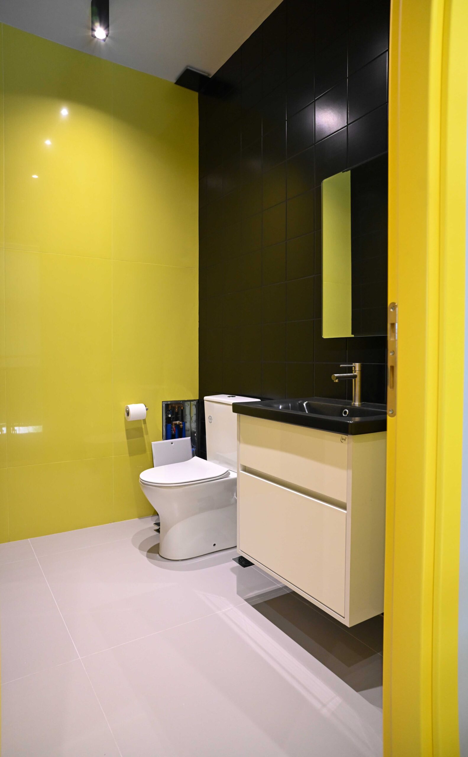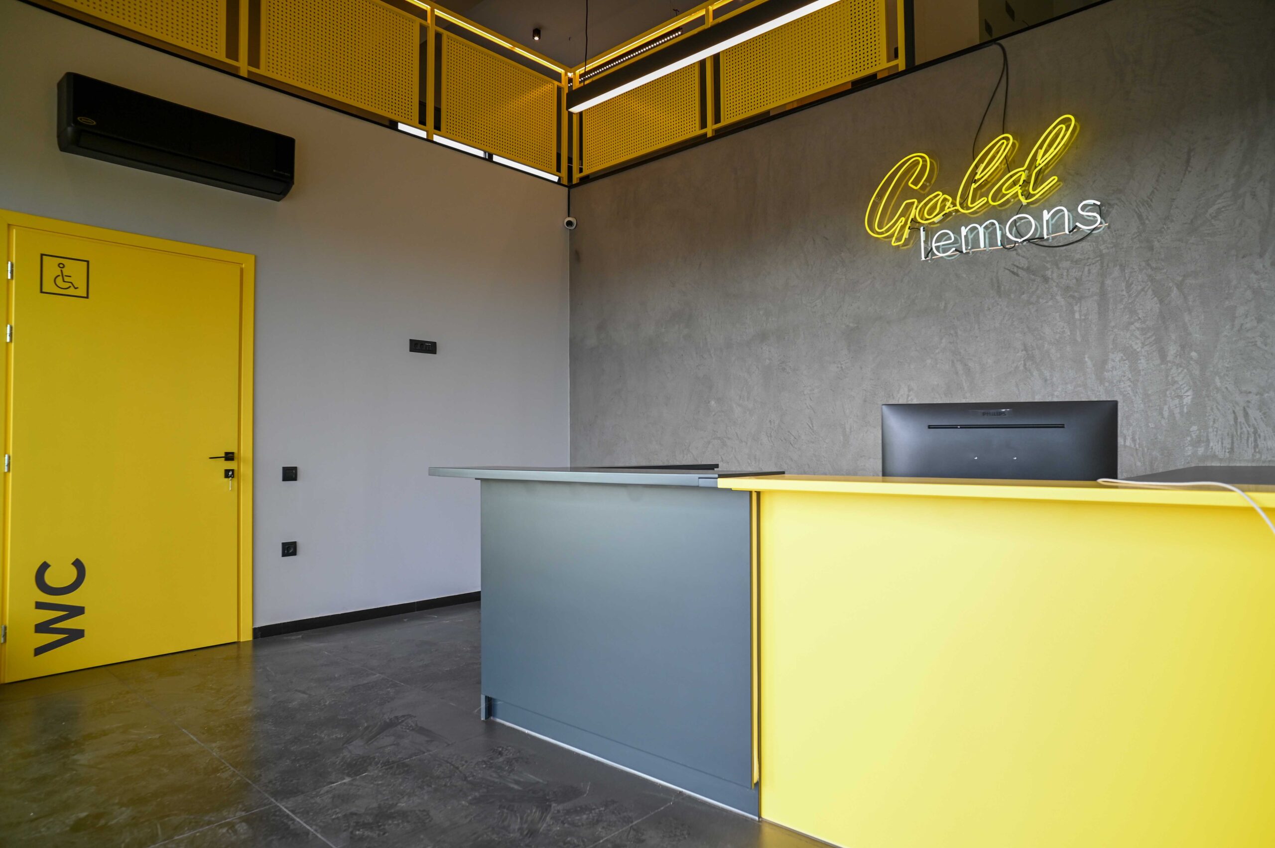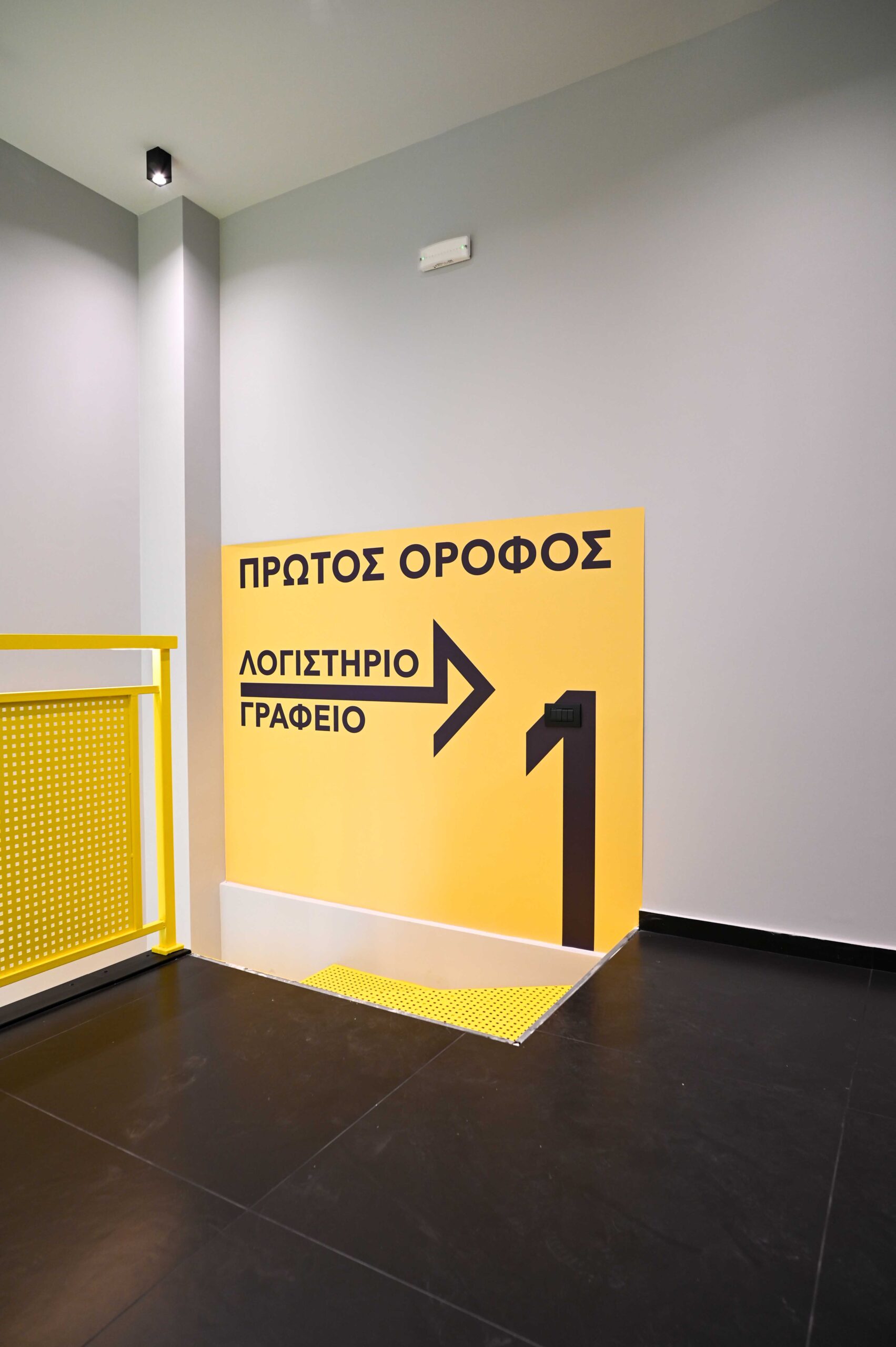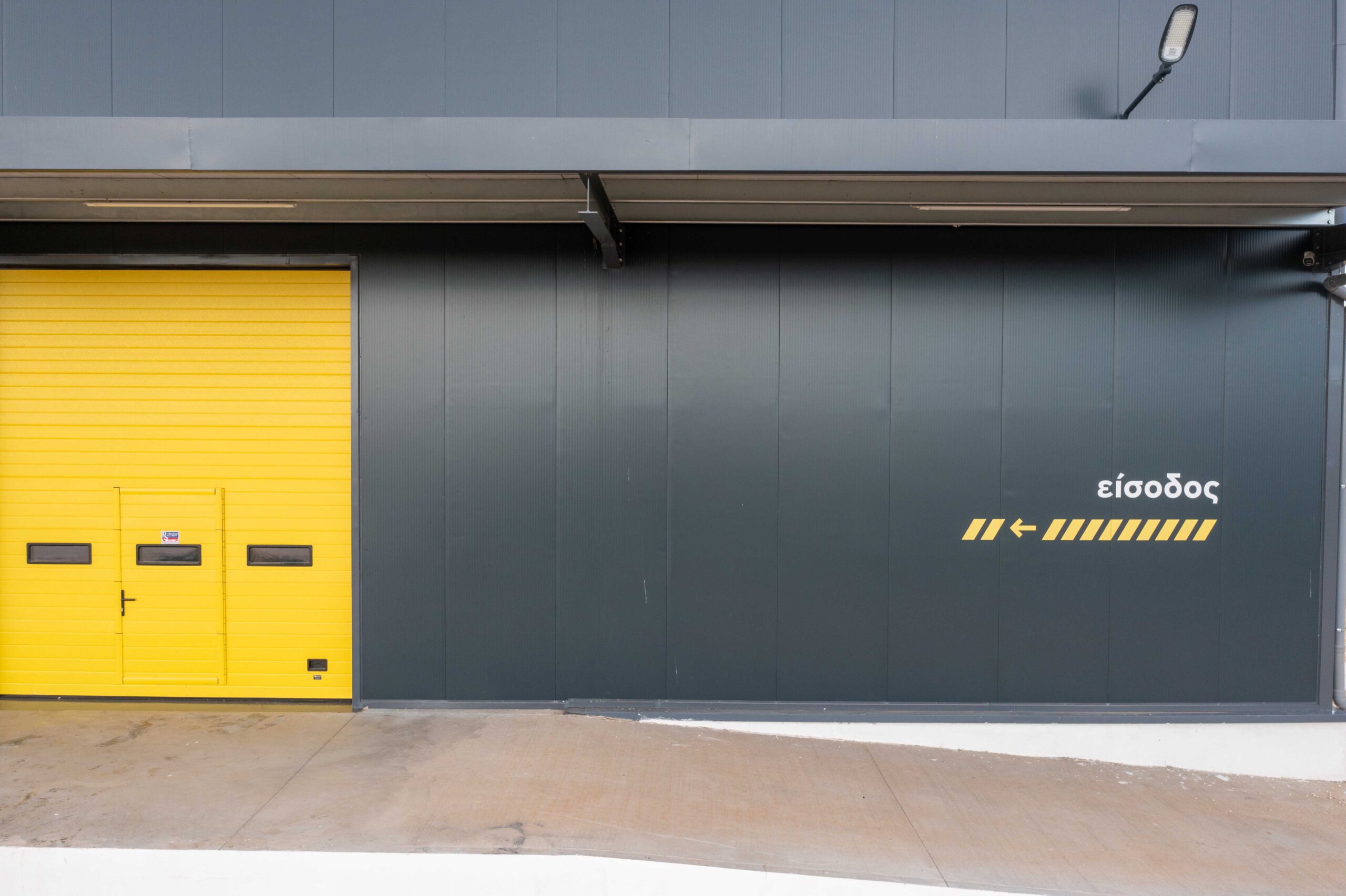 Για να προσθέσουμε ένταση και δυναμικότητα στον σχεδιασμό, έχουμε ενσωματώσει τη χρήση έντονου κίτρινου χρώματος σε όλη την σήμανση, το οποίο έρχεται σε όμορφη αντίθεση με τα σκούρα γκρι μεταλλικά πάνελ. Αυτό προσθέτει χρωματικό ενδιαφέρον στον κατά τα άλλα μονόχρωμο συνδυασμό και ενισχύει τον σκοπό του κτιρίου – να συσκευάζει λεμόνια.