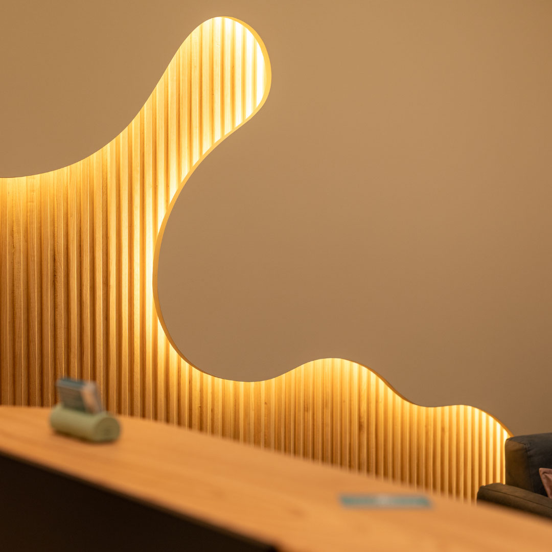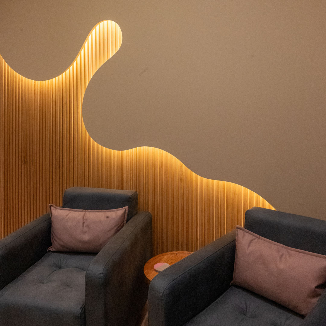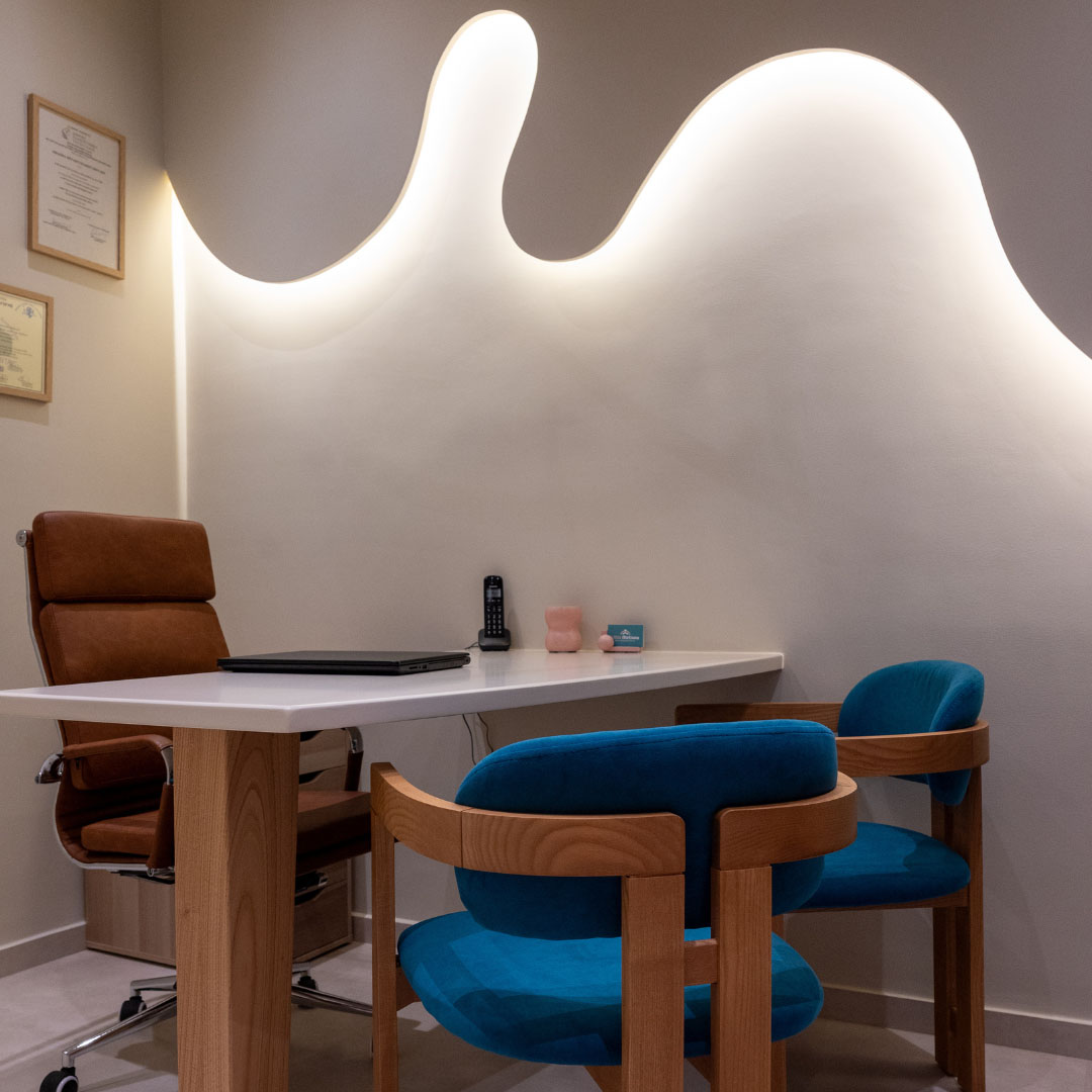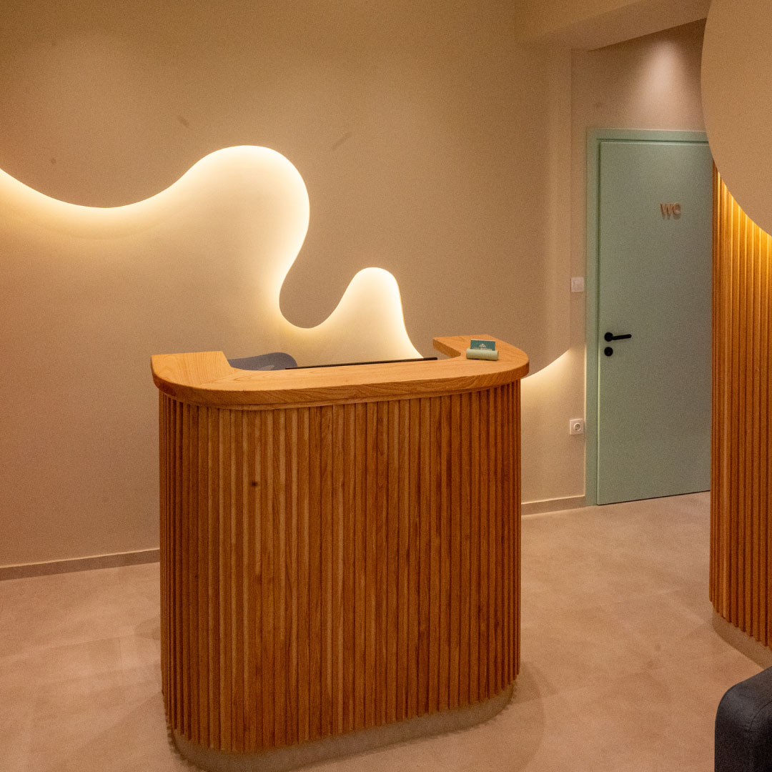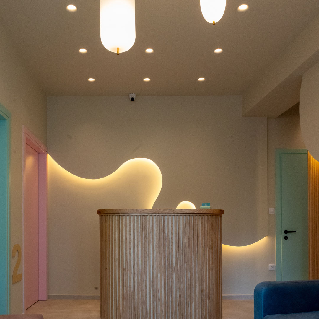 Σε έναν χώρο συνολικής επιφάνειας 80 τ.μ., η αρχιτεκτονική αντιμετωπίζεται ως ένα ενιαίο σύστημα όπου μορφή, υλικότητα και φως συνεργάζονται, δημιουργώντας ένα περιβάλλον που υποστηρίζει τη συγκέντρωση, τη σωματική αντίληψη και την αίσθηση ασφάλειας. Οι καμπύλες γραμμές διατρέχουν τον χώρο σε διαφορετικές κλίμακες και εφαρμογές, απομακρύνοντας κάθε αίσθηση αυστηρότητας και ενισχύοντας τη φυσική ροή της κίνησης.