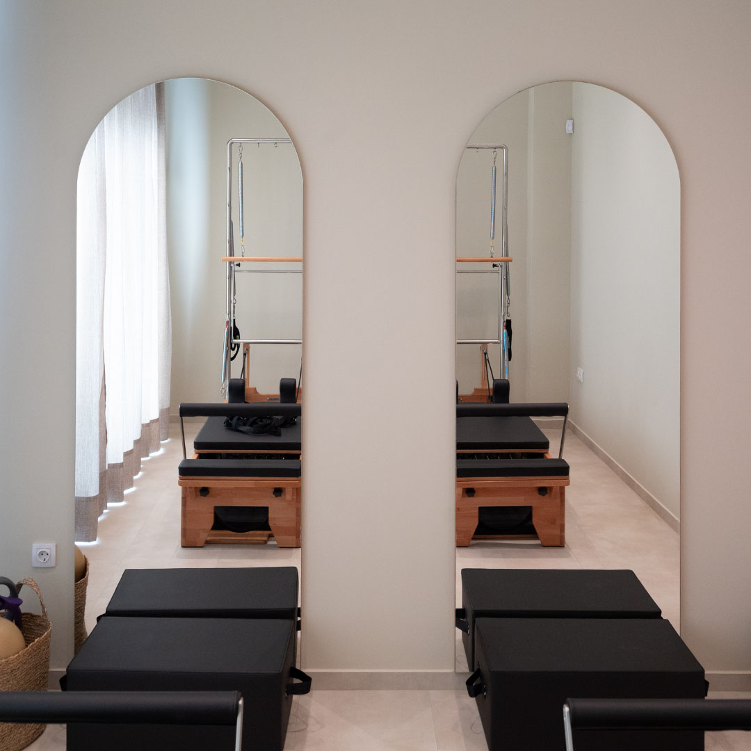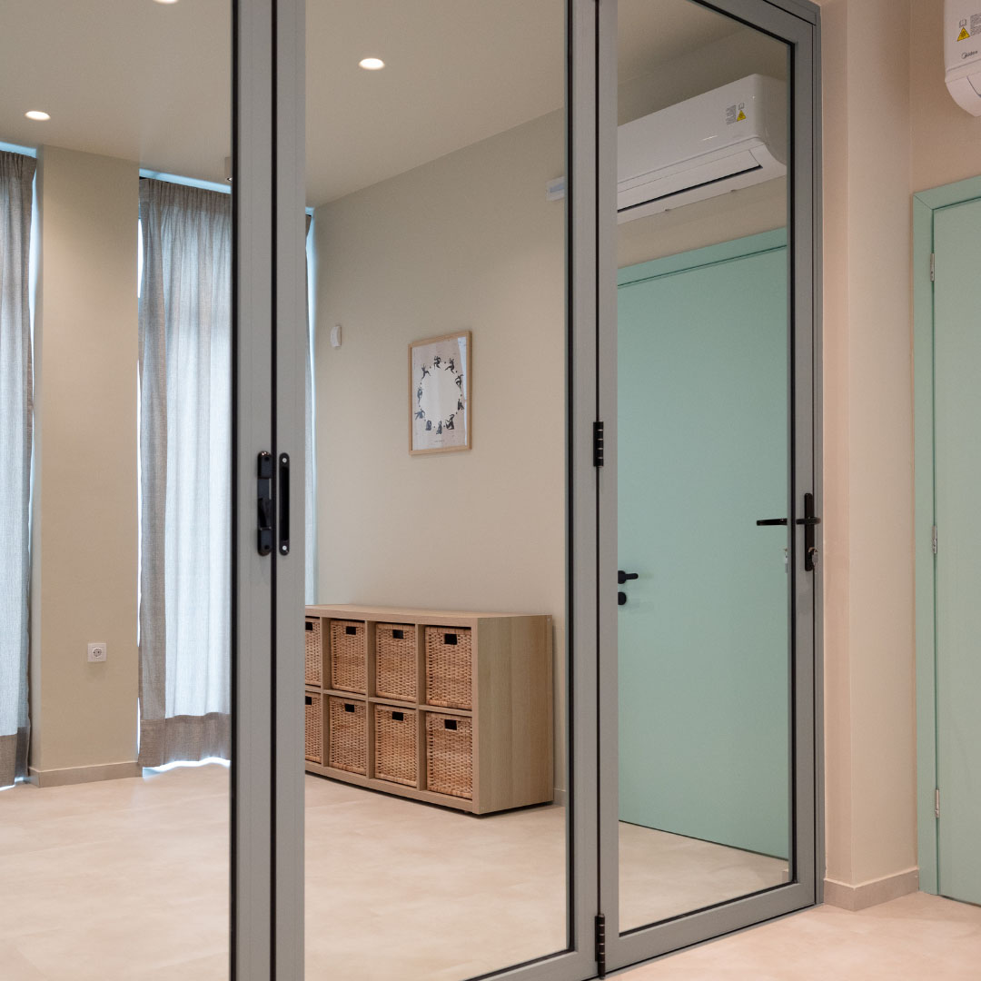 Οι καθρέπτες υψηλής αντοχής αντικαθιστούν τις συμβατικές πόρτες και επιτρέπουν στον θεραπευτή να εργάζεται με τον αντικατοπτρισμό του σώματος του παιδιού, ενισχύοντας τη σωματική επίγνωση. Παράλληλα, η μεταφερόμενη φύση τους προσδίδει ευελιξία, επιτρέποντας στον χώρο να ανοίγει και να μετασχηματίζεται όταν απαιτείται ομαδική λειτουργία.